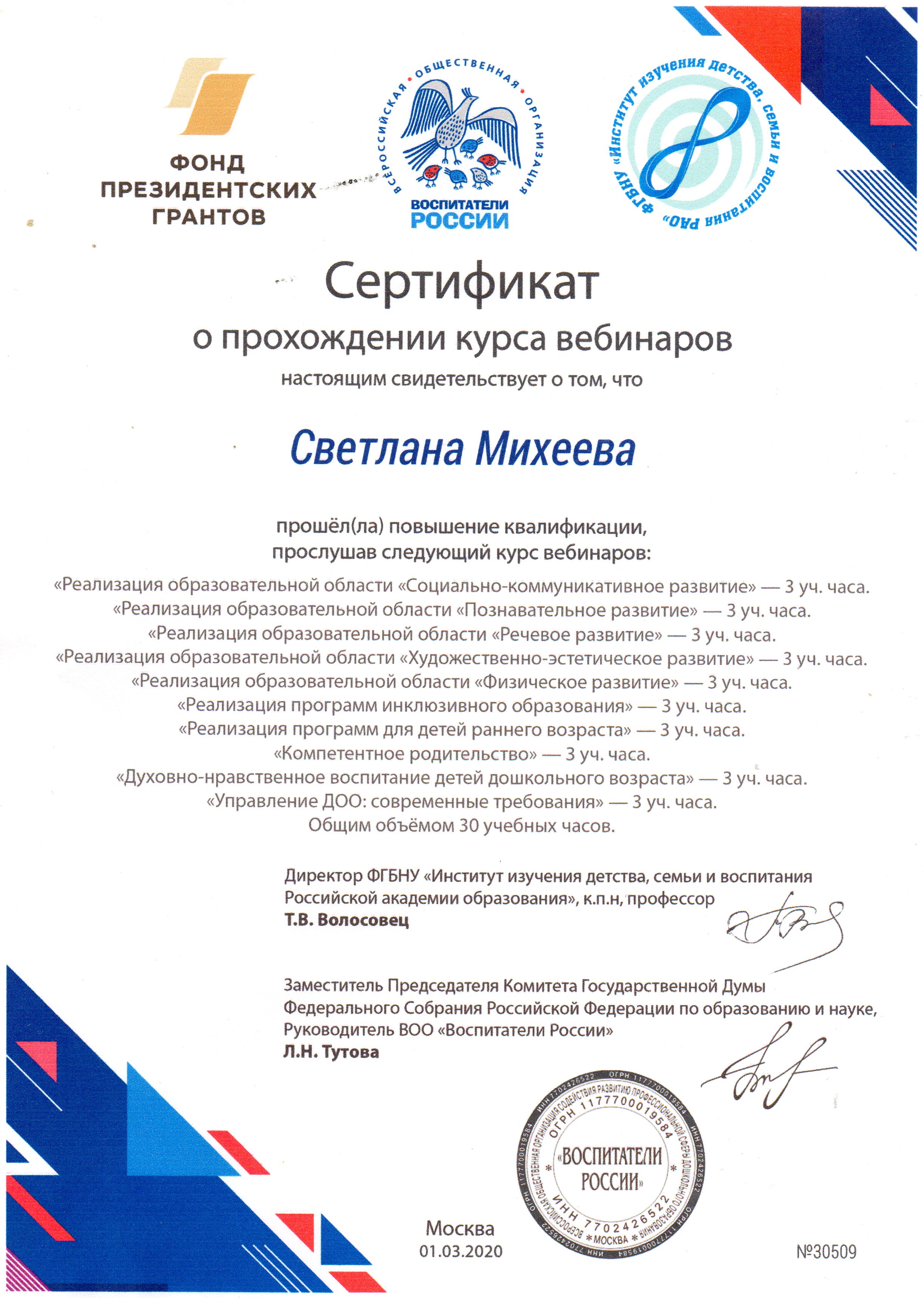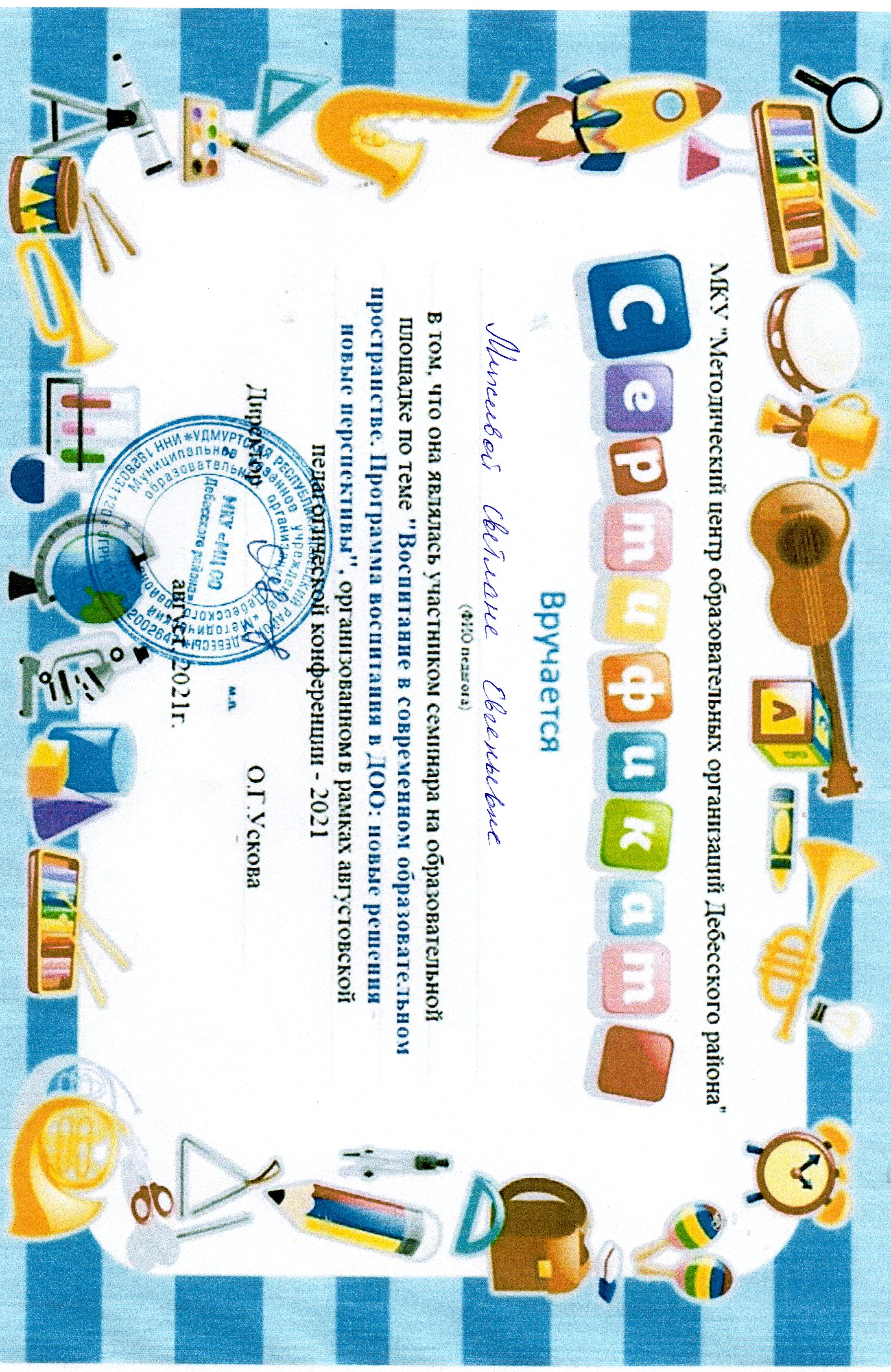 Сертификат участника семинара на образовательной площадке по теме "Воспитание в современном образовательном пространстве. Программа воспитания в ДОО: новые решения - новые перспективы", 2021 год