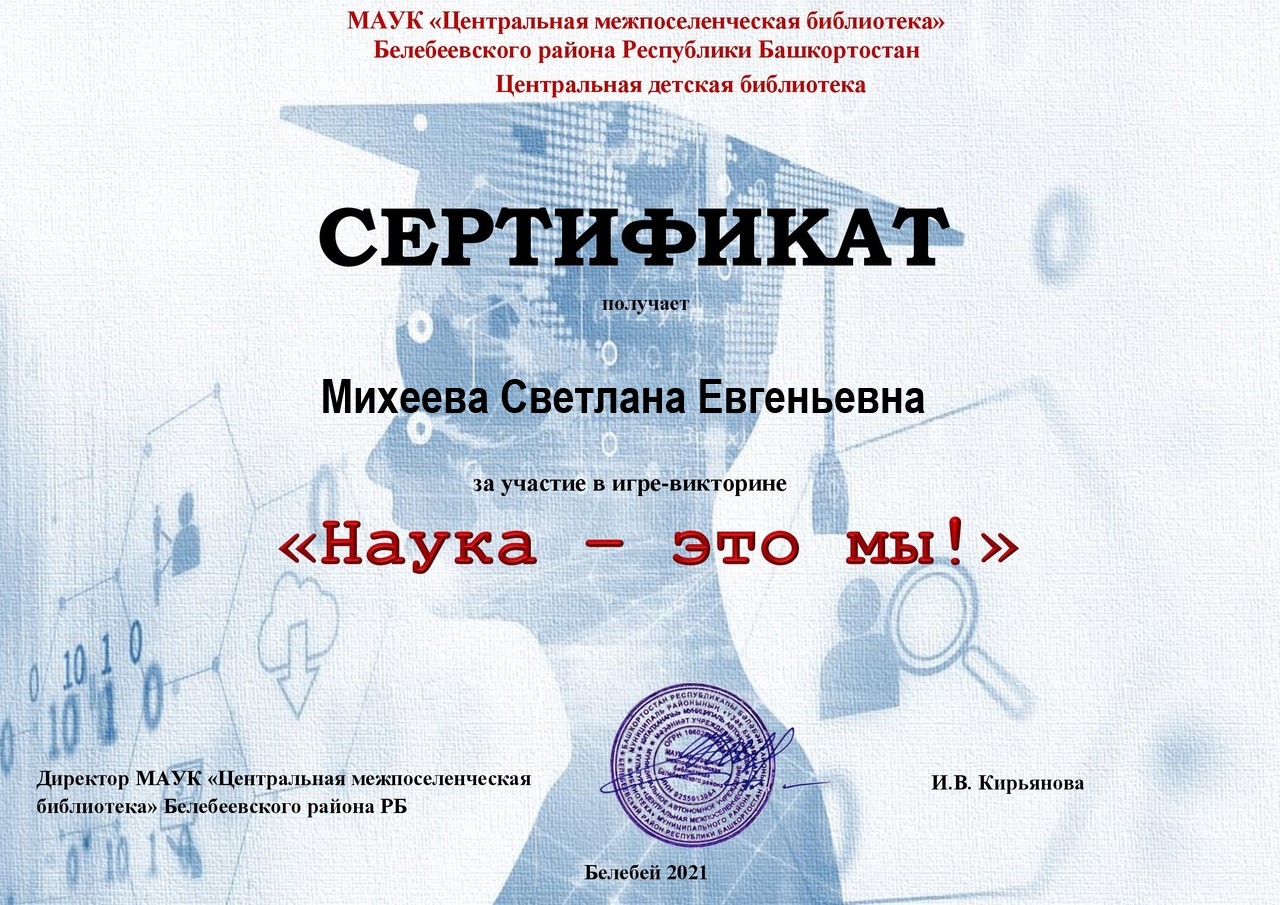 Сертификат за участие в игре-викторине "Наука - это мы!", 2021 год