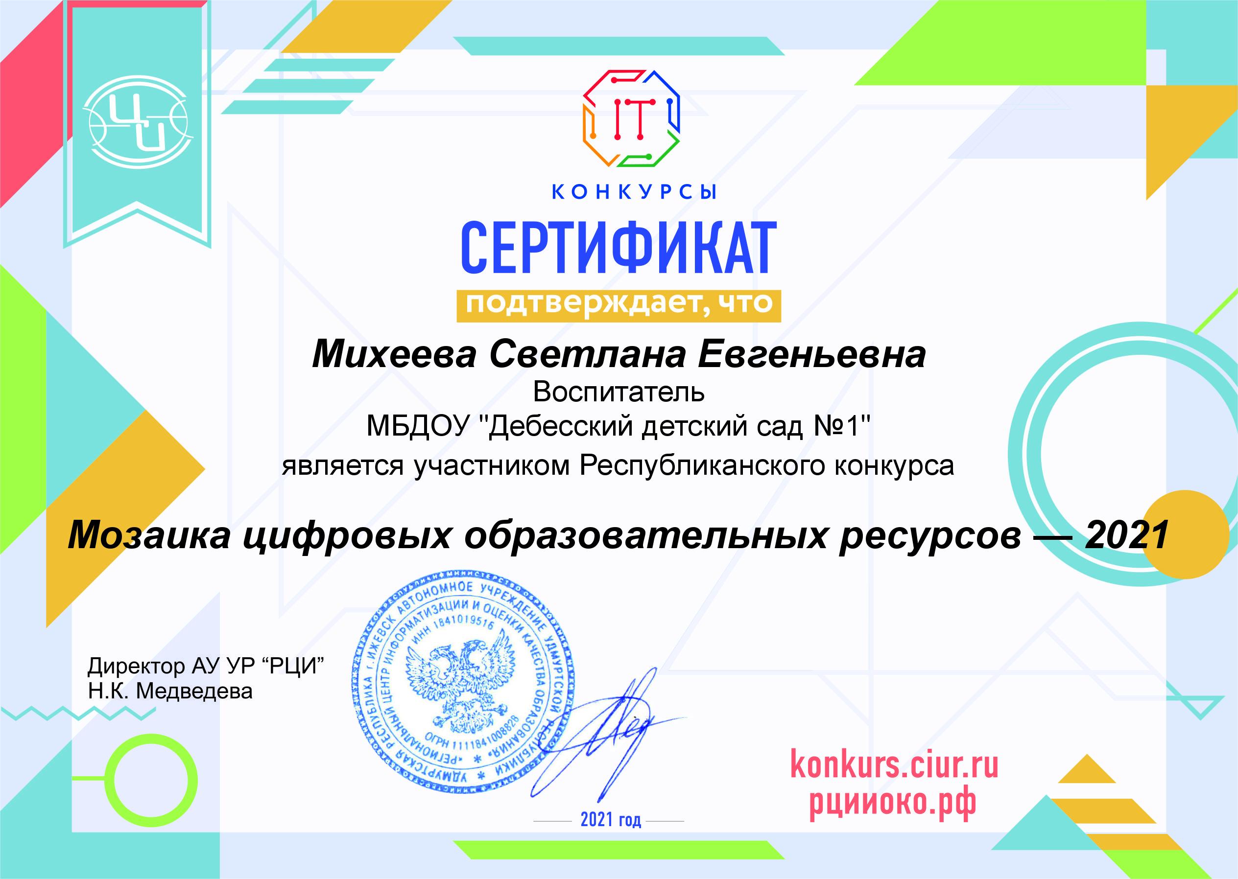 Сертификат за участие в Республиканском конкурсе "Мозаика цифровых образовательных ресурсов - 2021", 2021 год