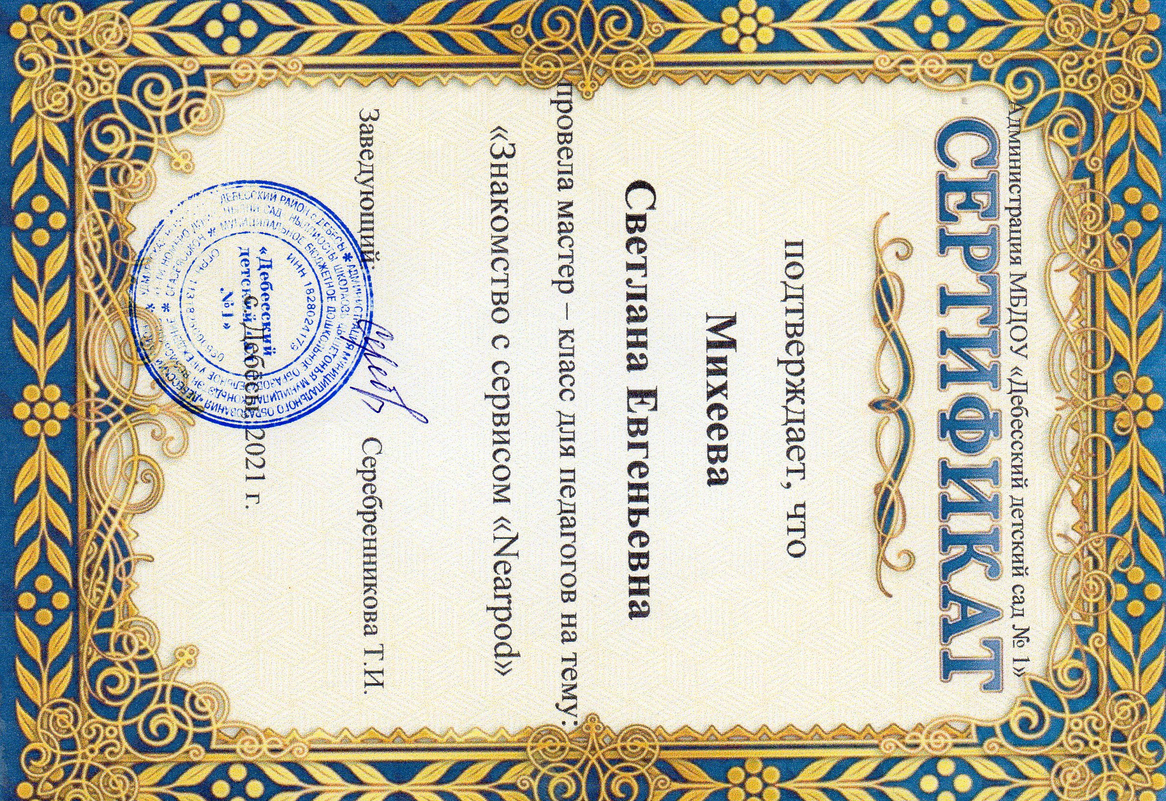 Сертификат за проведение мастер-класса для педагогов по теме: "Знакомство с сервисом Hearpod", 2021 год