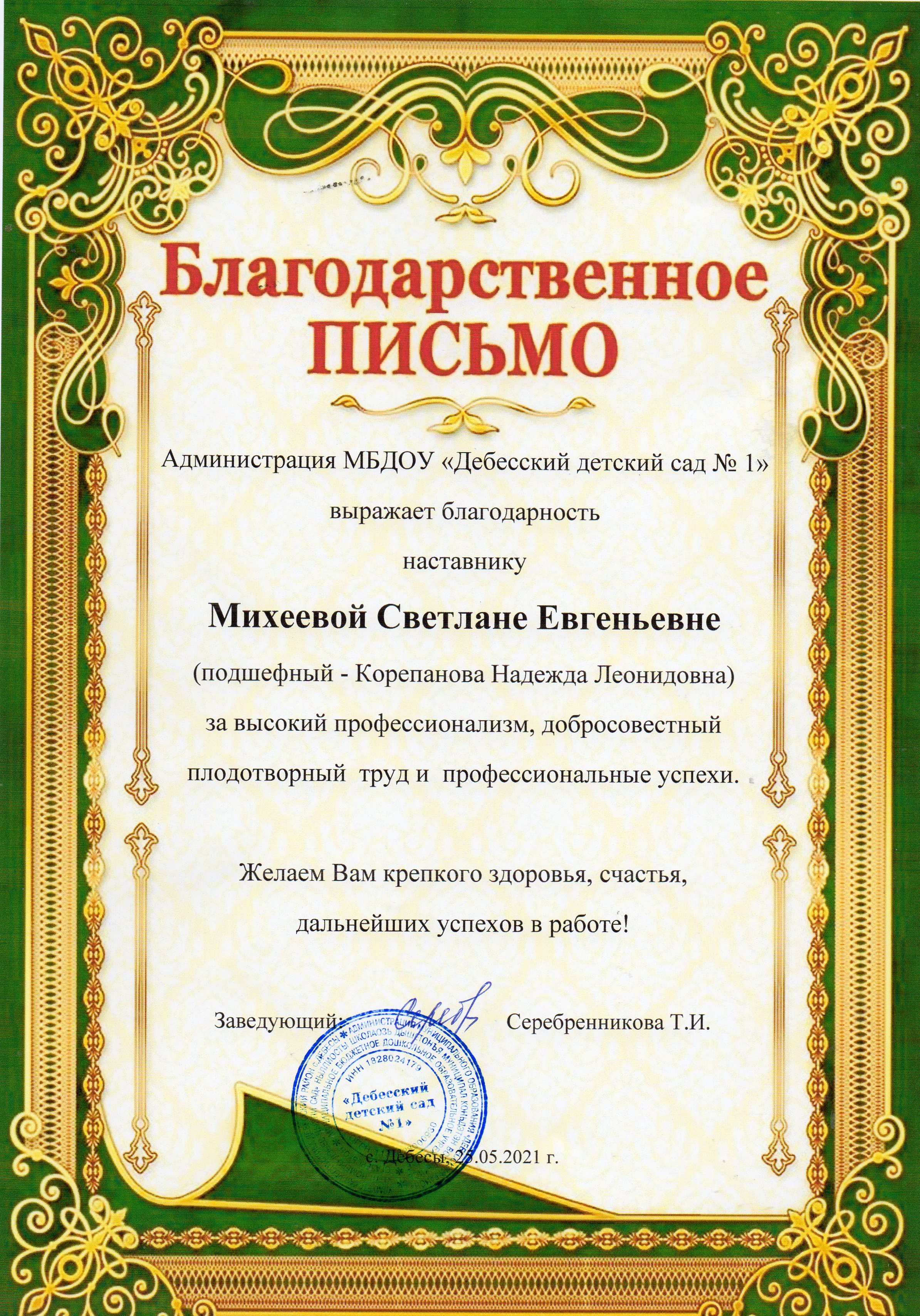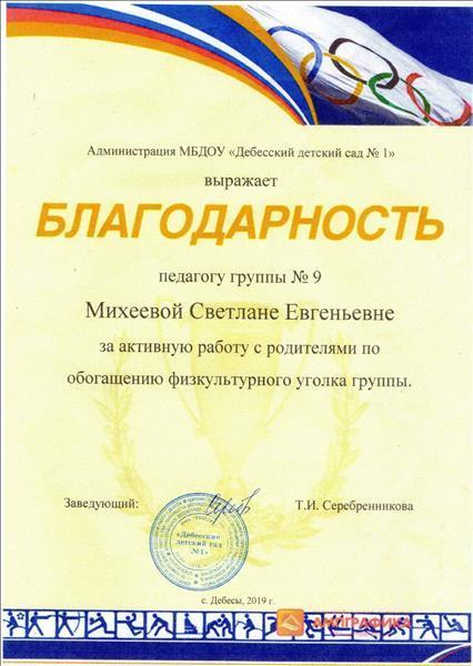 Благодарность за активную работу с родителями по обогащению физкультурного уголка группы, 2019 год
