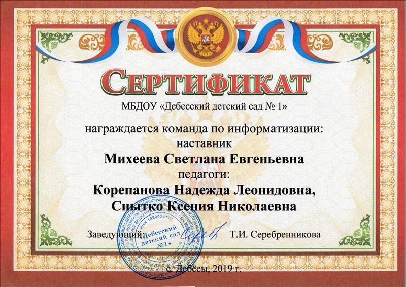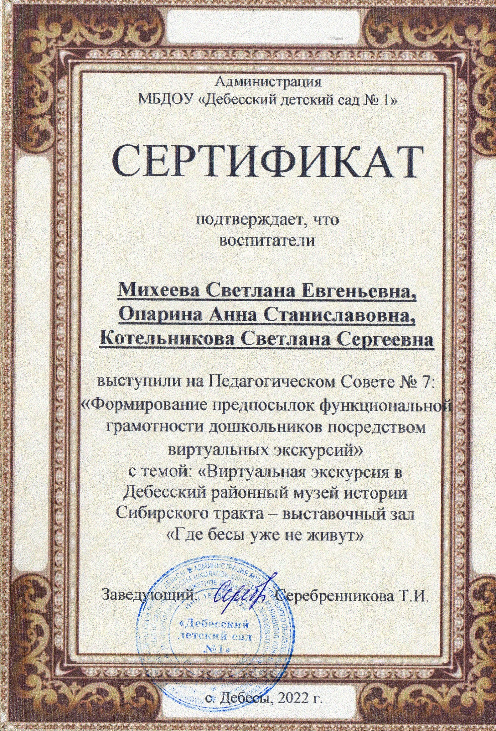 Сертификат за выступление на Педагогическом Совете "Формирование предпосылок функциональной грамотности дошкольников посредством виртуальных экскурсий" с темой "Виртуальная экскурсия в Дебесский районный музей истории Сибирского тракта - выставочный зал "Где бесы уже не живут", 2022 год