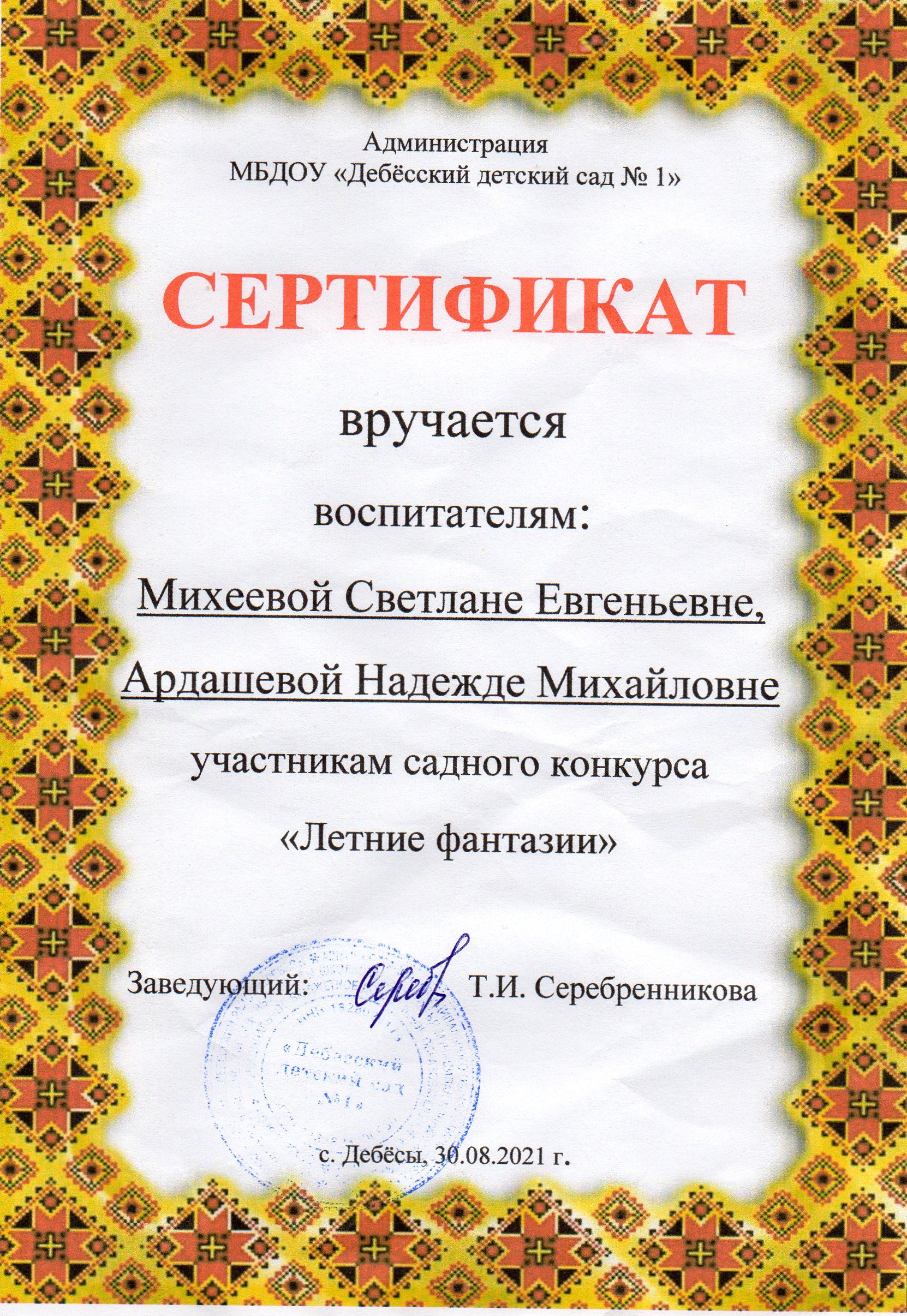 Сертификат за участие в садном конкурсе "Летние фантазии", 2021 год