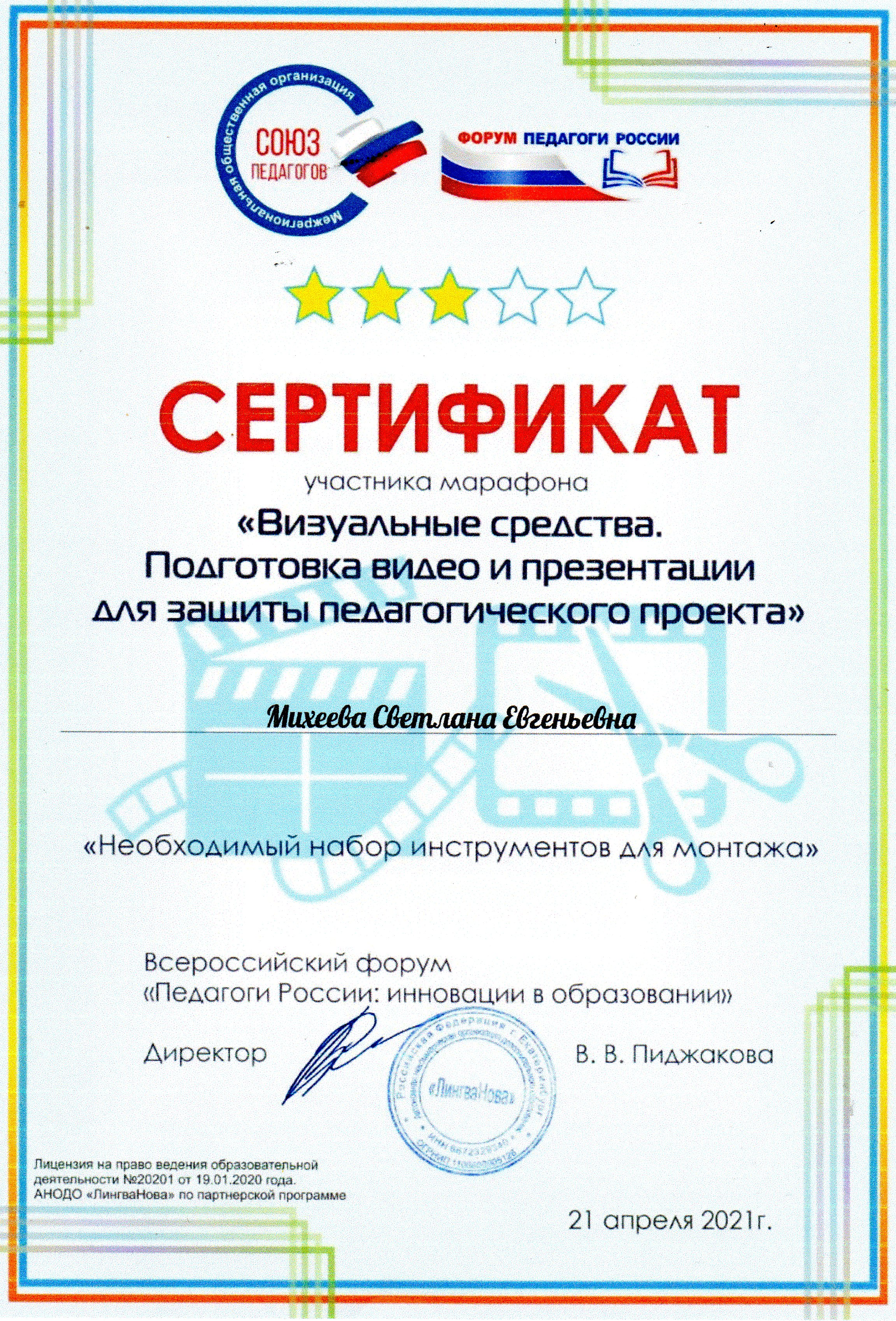 Сертификат участника марафона "Визуальные средства. Подготовка видео и презентации для защиты педагогического проекта". Тема: "Необходимый набор инструментов для монтажа", 2021 год