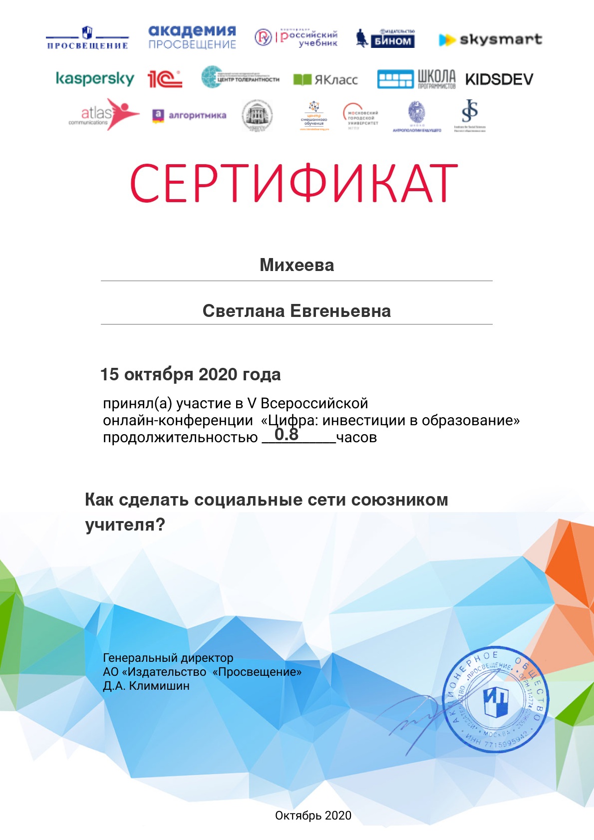 Сертификат за участие в V Всероссийской педагогической онлайн-конференции "ЦИФРА": инвестиции в педагога" по теме: "Как сделать социальные сети союзником учителя?", 2020 год