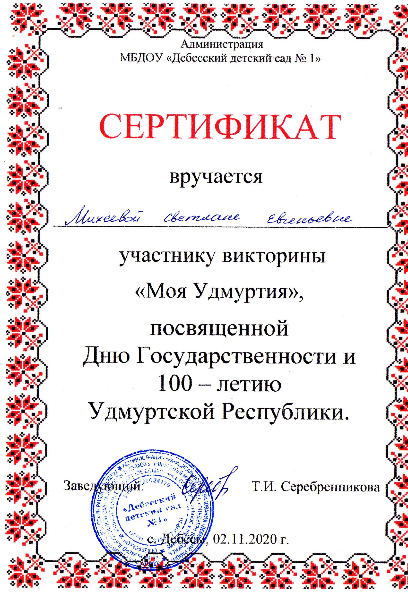 Сертификат участника викторины "Моя Удмуртия", посвященной Дню Государственности и 100 - летию Удмуртской Республики", 2020 год