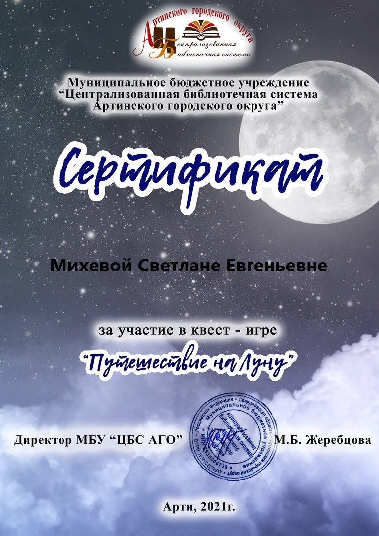 Сертификат за участие в квест-игре "Путешествие на Луну", 2021 год