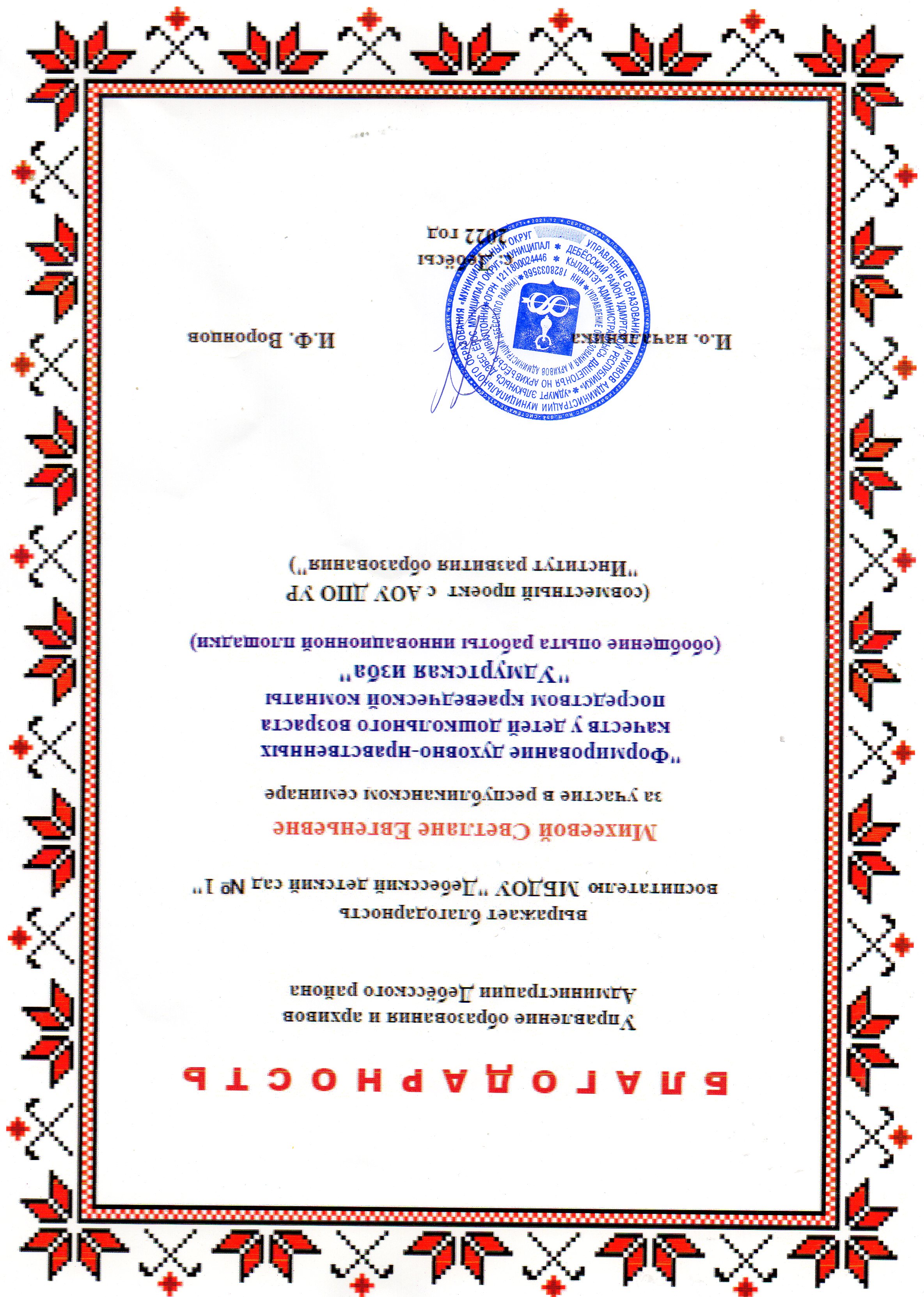 Благодарность за участие в республиканском семинаре "Формирование духовно-нравственных качеств у детей дошкольного возраста посредством краеведческой комнаты "Удмуртская изба", 2022 год
