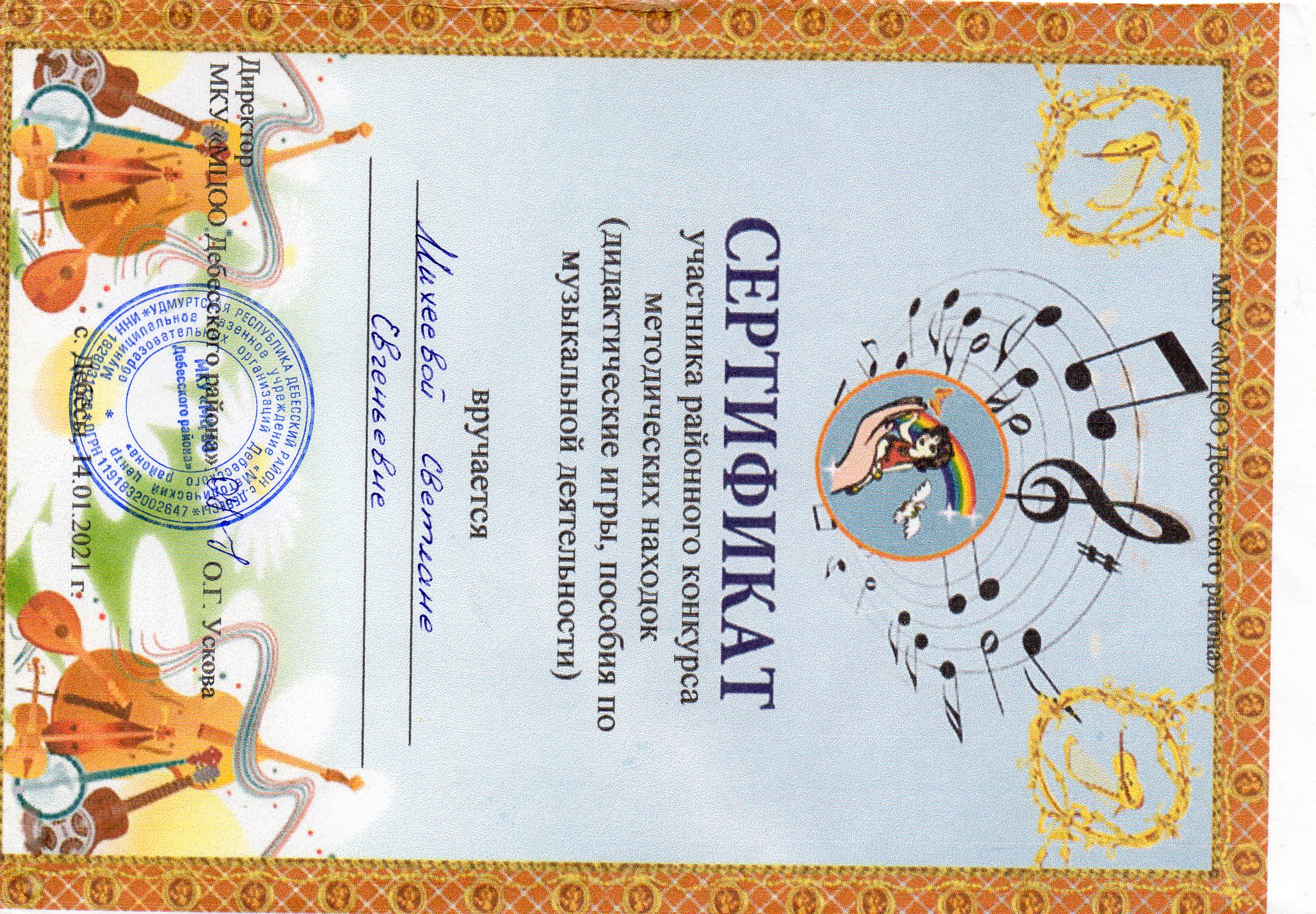 Сертификат за участие в районном конкурсе методических находок по музыкальной деятельности, 2021 год