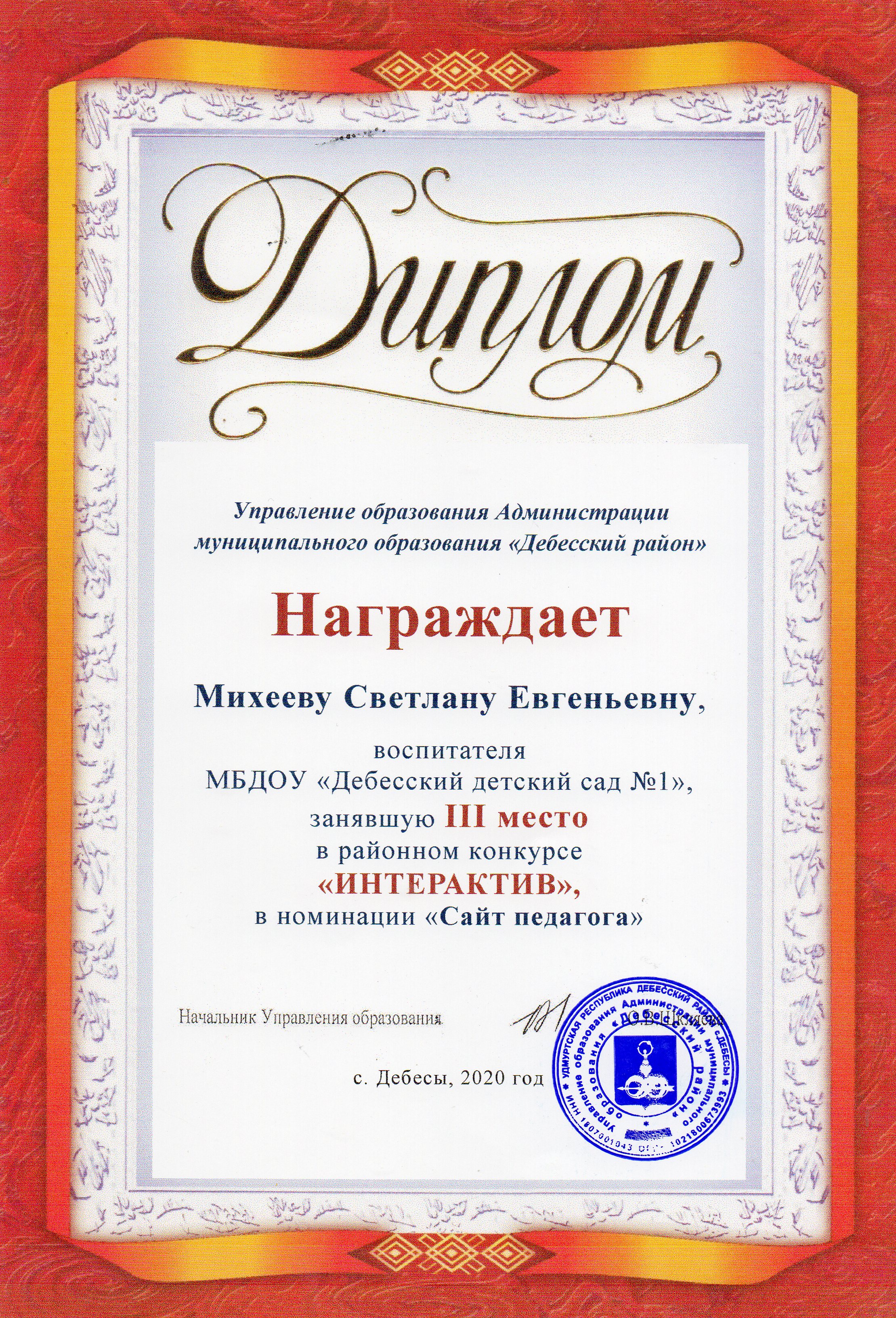 Диплом за 3 место в районном конкурсе "Интерактив", номинация "Сайт педагога", 2020 год