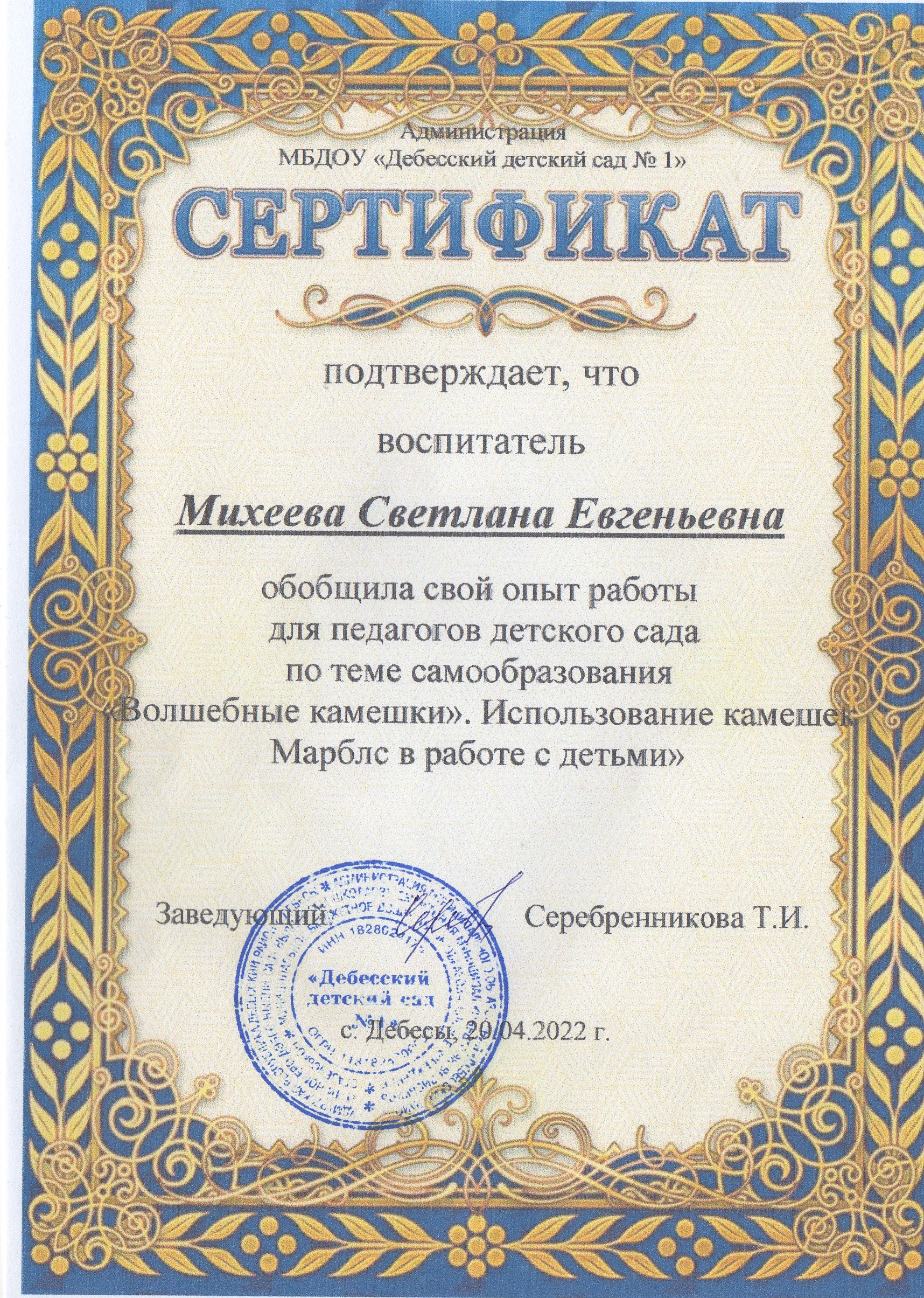 Сертификат за обобщение своего опыта работы по теме "Волшебные камешки. Использование камешек Марблс в работе с детьми", 2022 год