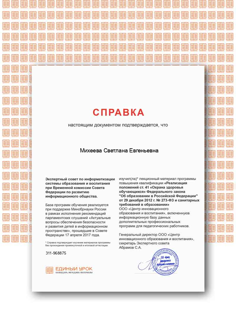 Справка об изучении лекционного материала программы повышения квалификации "Реализация положений ст.41 "Охрана здоровья обучающихся" Федерального закона "Об образовании в Российской Федерации" от 29 декабря 2012 г. №273-ФЗ и санитарных требований в образовании", 2020 год
