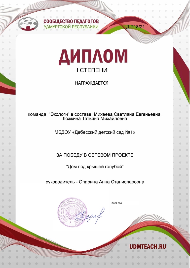 Диплом за победу в республиканском сетевом проекте "Дом под крышей голубой", 2021 год