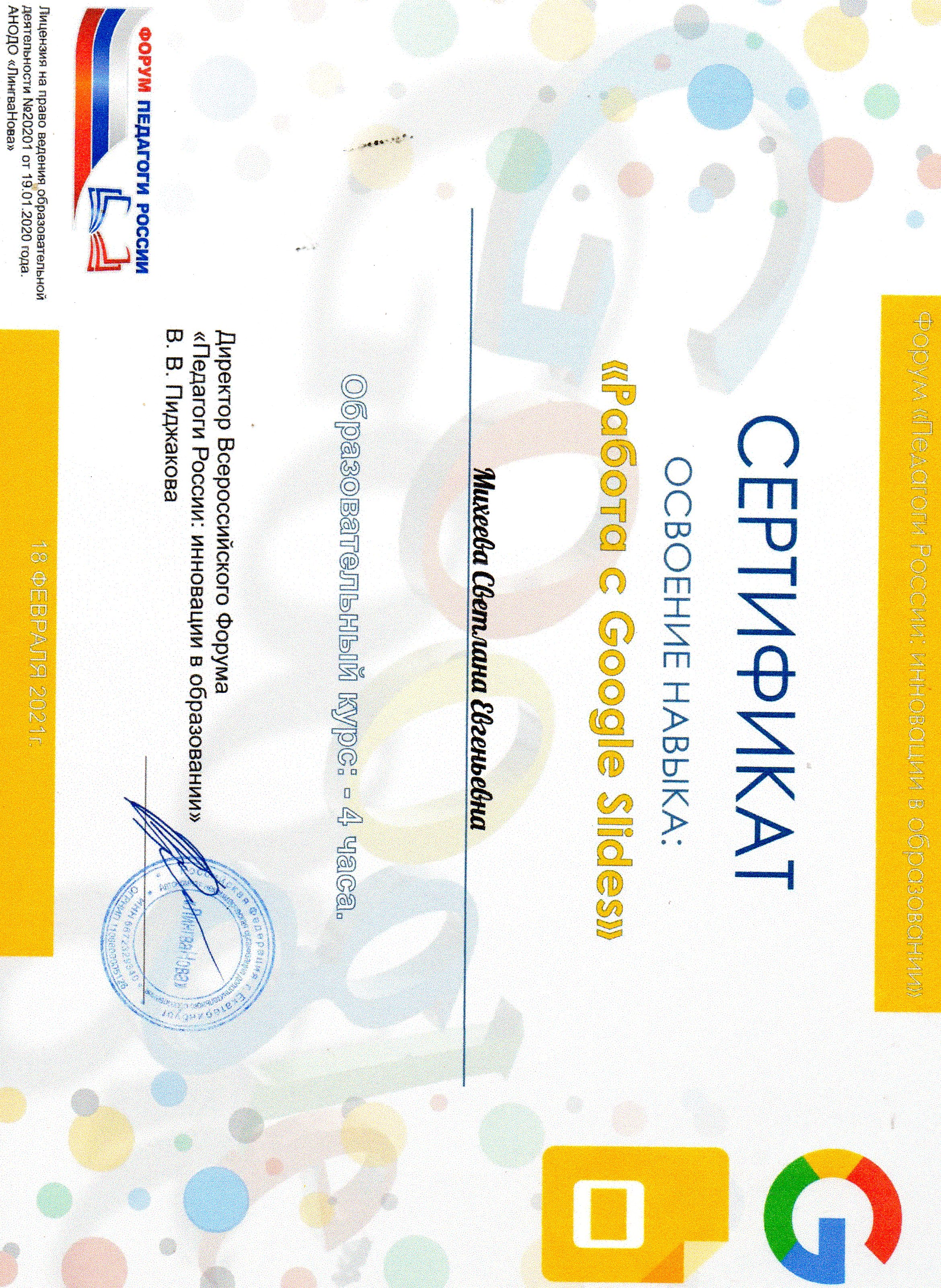 Сертификат об освоении навыка "Работа с гугл-слайдами" - 4 часа, 2021 год