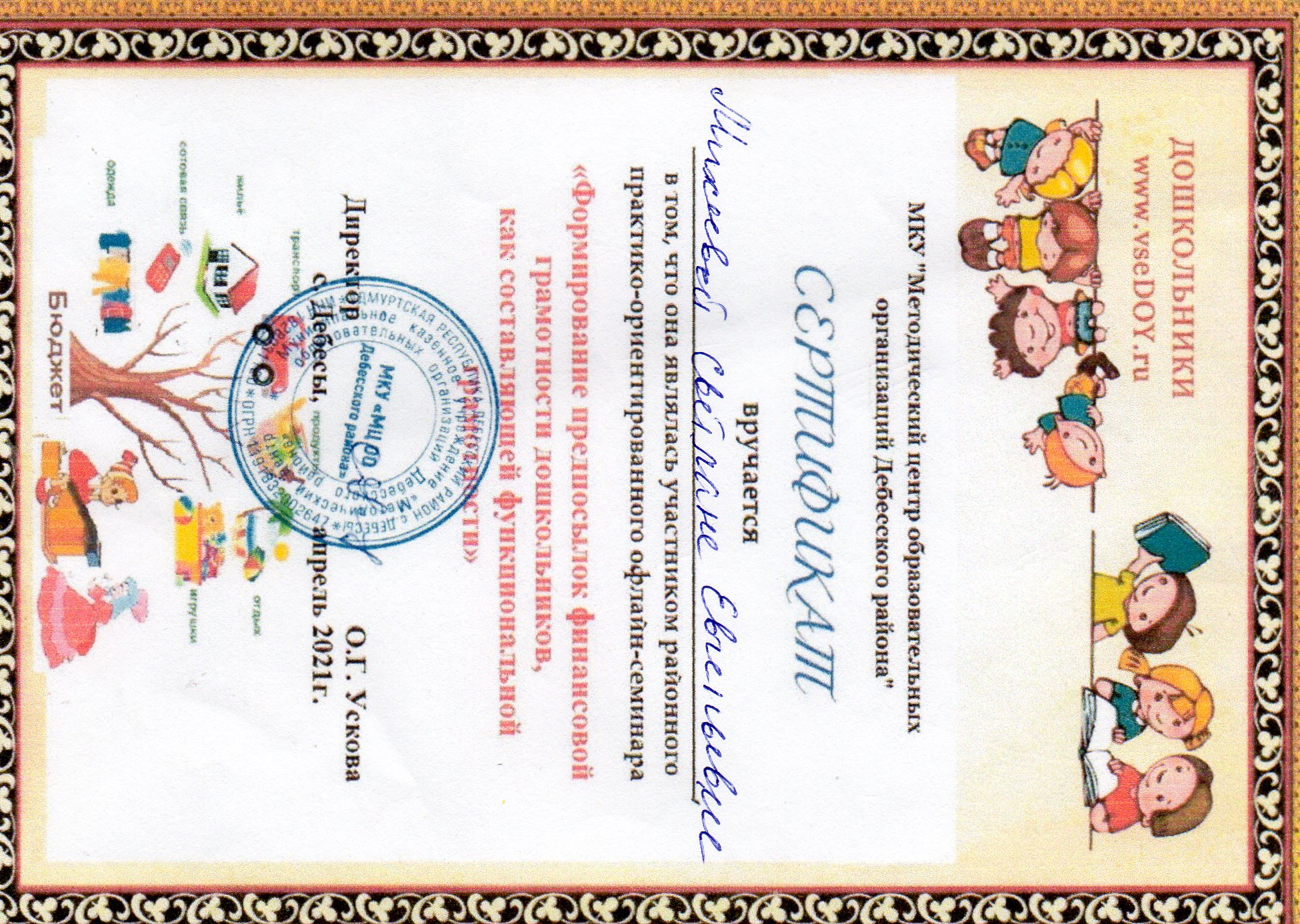 Сертификат за участие в районном оффлайн-семинаре на тему "Формирование предпосылок финансовой грамотности дошкольников как составляющей функциональной грамотности", 2021 год