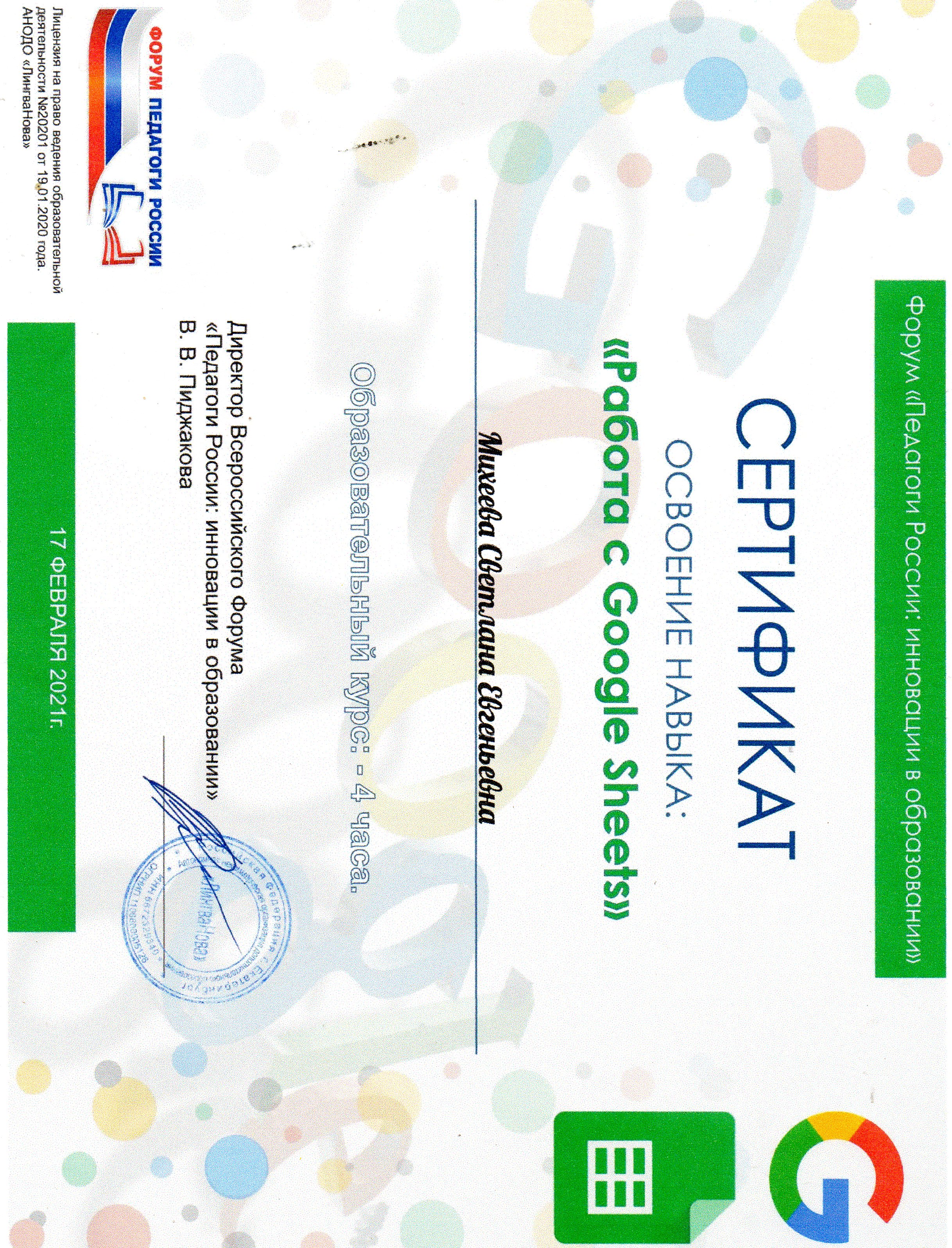Сертификат об освоении навыка "Работа с гугл-таблицами" - 4 часа, 2021 год