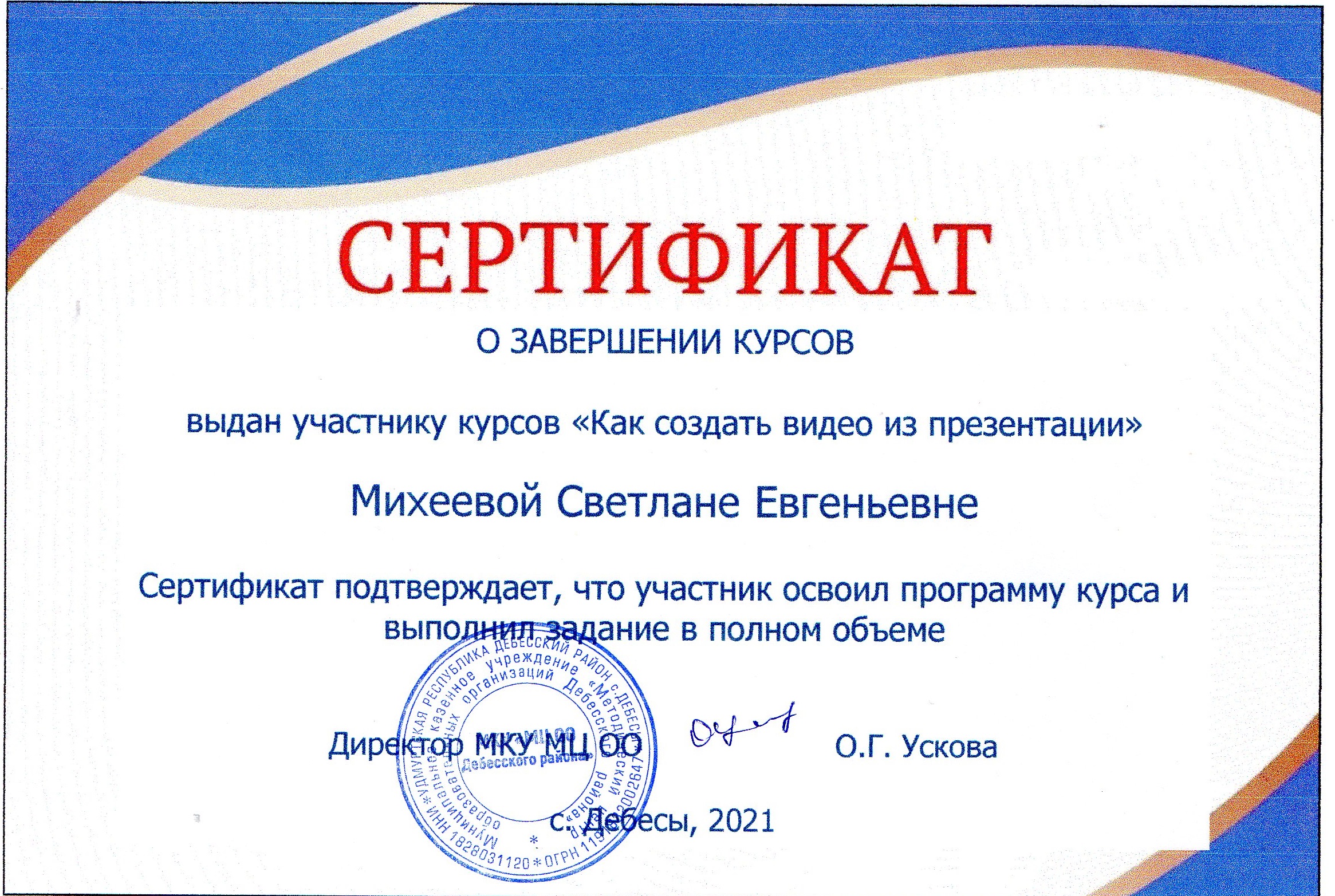 Сертификат участника курса "Как создать видео из презентации", 2021 год