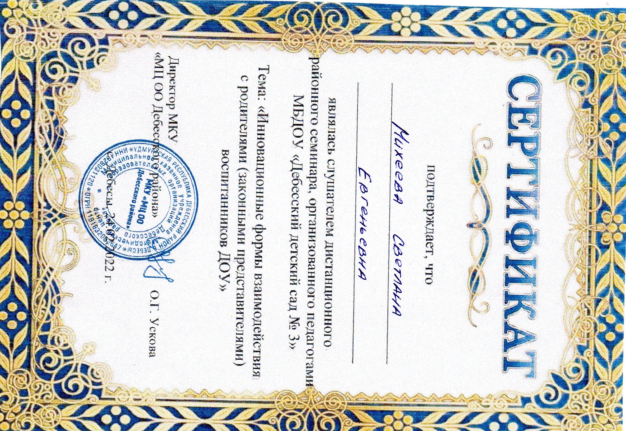 Сертификат слушателя дистанционного районного семинара по теме "Инновационные формы взаимодействия с родителями (законными представителями) воспитанников ДОУ", 2022 год