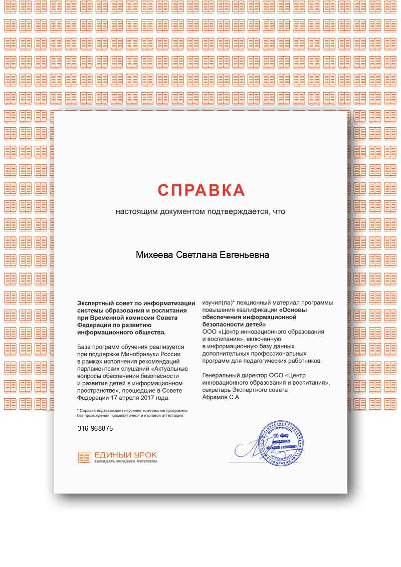 Справка об изучении лекционного материала программы повышения квалификации "Основы обеспечения информационной безопасности детей", 2020 год