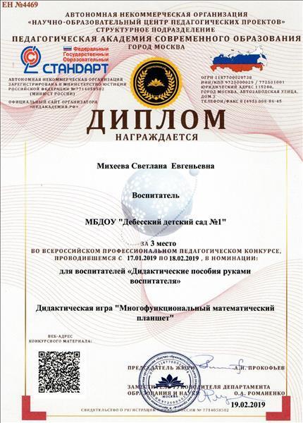 Диплом за 3 место во Всероссийском профессиональном педагогическом конкурсе, в номинации "Дидактические пособия руками воспитателя", 2019 год
