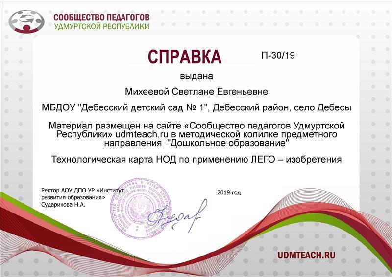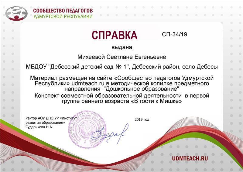 Справка о размещении материала на сайте "Сообщество педагогов Удмуртской Республики", 2019 год