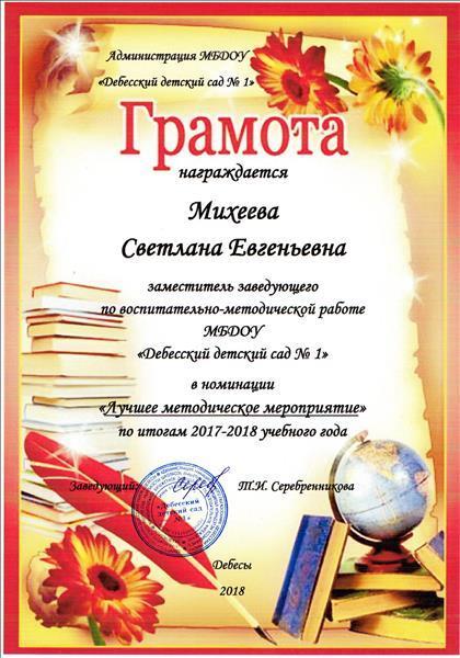 Грамота в номинации за лучшее методическое мероприятие по итогам 2017-2018 учебного года", 2018 год