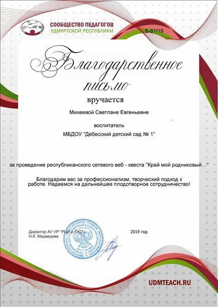 Благодарственное письмо за проведение республиканского сетевого веб-квеста "Край мой Родниковый...", 2019 год