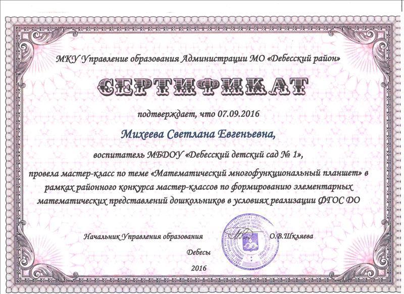 Сертификат за проведение мастер-класса по теме "Математический многофункциональный планшет" в рамках районного конкурса по формированию элементарных математических представлений дошкольников в условиях реализации ФГОС ДО
