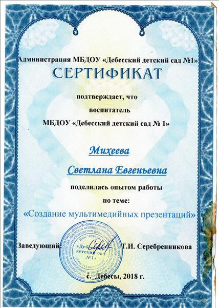 Сертификат за обобщение опыта по теме: "Создание мультимедийных презентаций", 2018 год