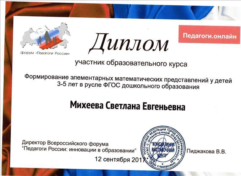 Диплом участника образовательного курса "Формирование элементарных математических представлений у детей 3-5 лет в русле ФГОС дошкольного образования", 2017 год