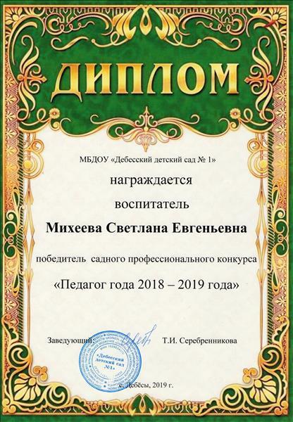 Диплом победителя садного профессионального конкурса "Педагог года 2018 - 2019", 2019 год