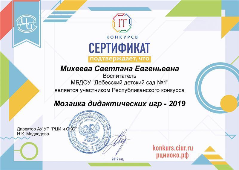 Сертификат участника Республиканского конкурса "Мозаика дидактических игр - 2019"
