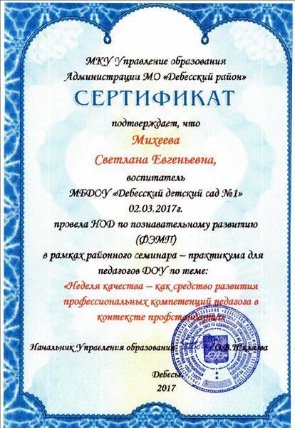 Сертификат за проведение НОД по познавательному развитию (ФЭМП) в рамках районного семинара-практикума для педагогов ДОУ по теме: "Неделя качества - как средство профессиональных компетенций педагога в контексте профстандарта", 2017 год