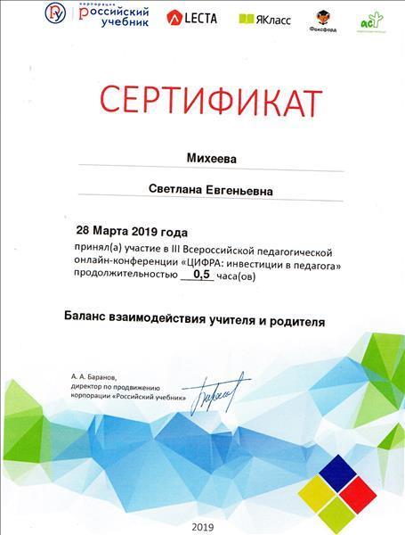 Сертификат за участие в III Всероссийской педагогической онлайн-конференции "ЦИФРА": инвестиции в педагога" по теме "Баланс взаимодействия учителя и родителя", 2019 год
