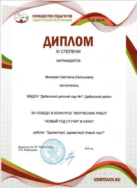 Диплом 3 степени за победу в конкурсе творческих работ "Новый год стучит в окно", 2019 год