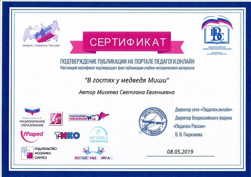 Сертификат за публикацию на портале "Педагоги. Онлайн", 2019 год