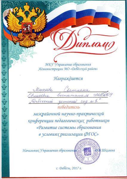 Диплом победителя межрайонной научно-практической конференции педагогических работников "Развитие системы образования в условиях реализации ФГОС", 2017 год