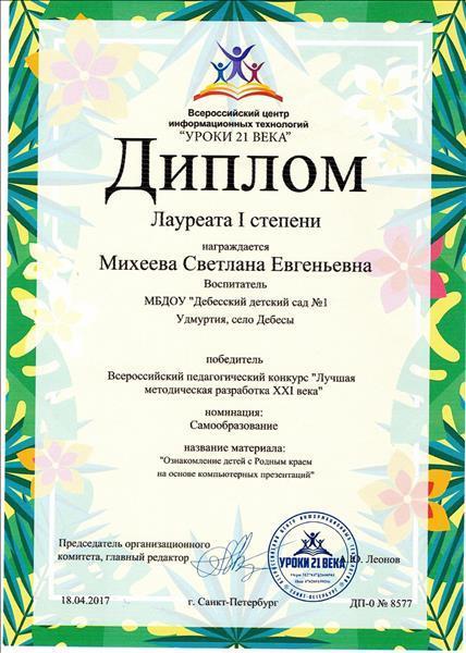 Диплом Лауреата 1 степени за участие во Всероссийском педагогическом конкурсе "Лучшая методическая разработка XXI века", 2017 год