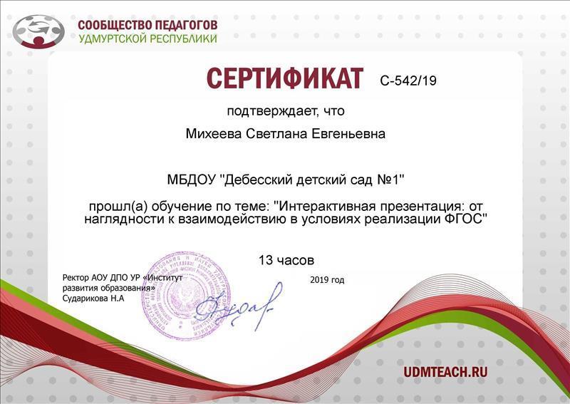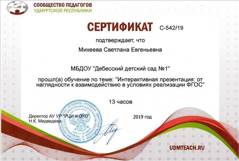 Сертификат подтверждает о прохождении обучения по теме: "Интерактивная презентация: от наглядности к взаимодействию в условиях реализации ФГОС", 2019 год