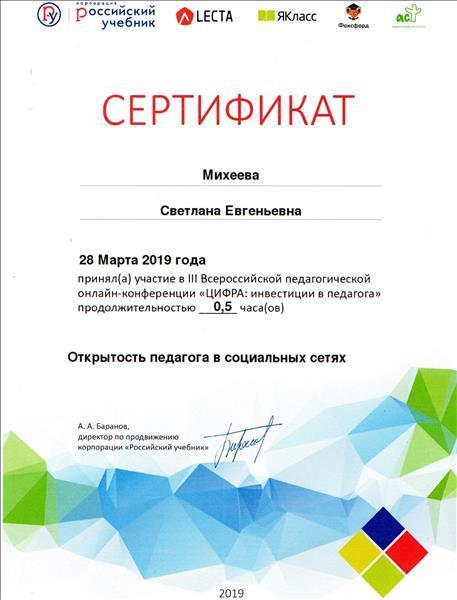 Сертификат за участие в III сероссийской педагогической онлайн-конференции "ЦИФРА: инвестиции в педагога" по теме "Проект "Школа, открытая инновациям": шаги на пути к успеху", 2019 год