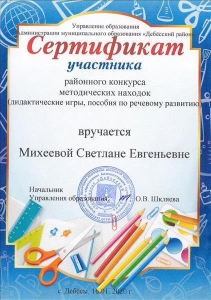 Сертификат участника районного конкурса методических находок (дидактические игры, пособия по речевому развитию), 2020 год