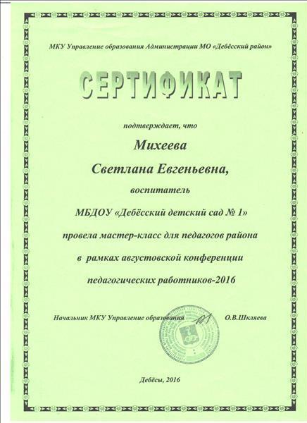 Сертификат за проведение мастер-класса для педагогов района в рамках августовской конференции педагогических работников - 2016
