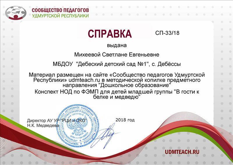Справка о размещении материала на сайте "Сообщество педагогов Удмуртской Республики", 2018 год