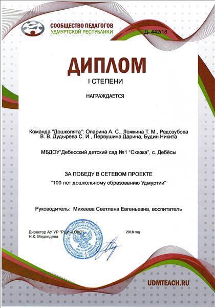 Диплом 1 степени за победу в сетевом проекте "100 лет дошкольному образованию Удмуртии", 2018 год