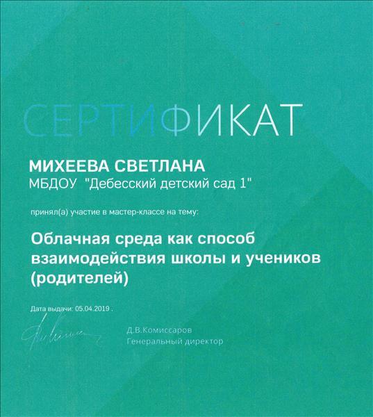 Сертификат участника мастер-класса "Облачная среда как способ взаимодействия школы и учеников (родителей)", 2019 год