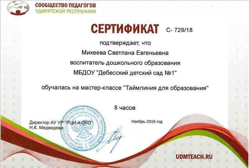 Сертификат о прохождении мастер-класса на тему: "Таймлиния для образования" 8 часов, 2018 год