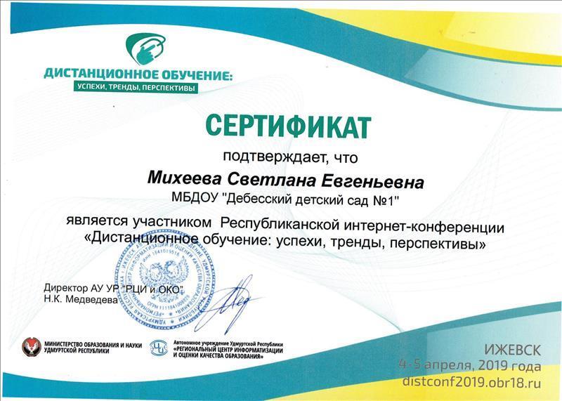 Сертификат за участие в Республиканской интернет-конференции: "Дистанционное обучение: успехи, тренды, перспективы", 2019 год