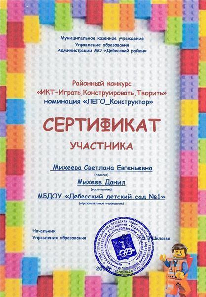 Сертификат участника районного конкурса "ИКТ-играть, Конструировать, Творить", 2019 год