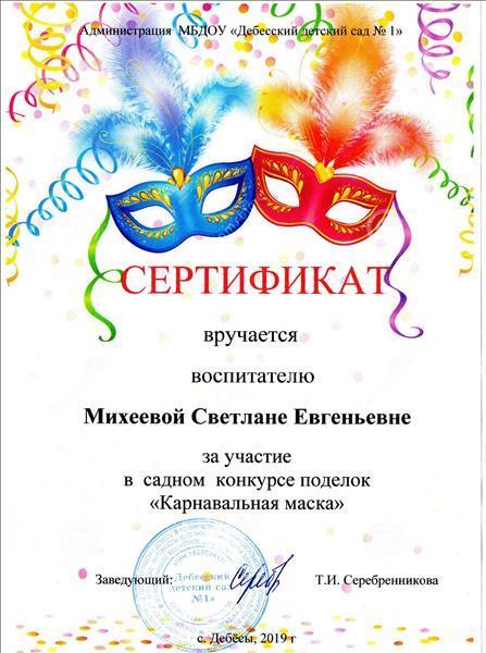Сертификат за участие в садном конкурсе поделок "Карнавальная маска", 2019 год