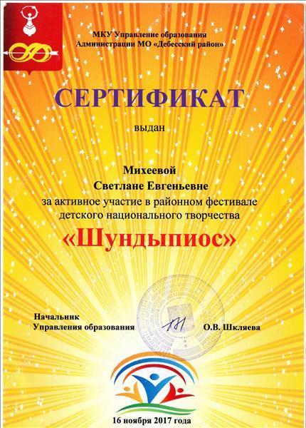 Сертификат за активное участие в районном фестивале детского национального творчества "Шундыпиос", 2017 год